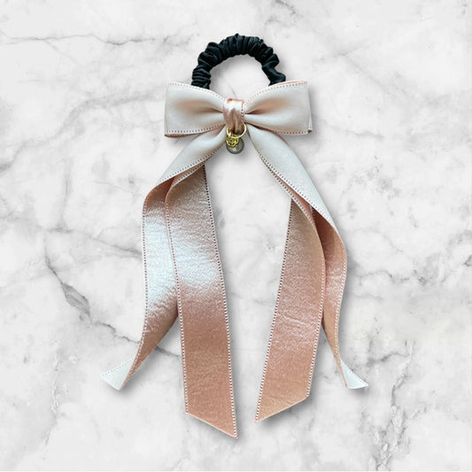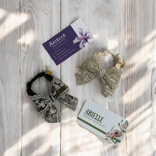 Elegant Black & Creamy Champagne Lace Bow Hair Tie – Handmade with Pearl Charm