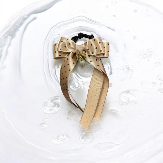 🎀✨ Pearl Charm Polka Dot Ribbon Hair Tie | Elegant Handmade Ponytail Holder ✨🎀