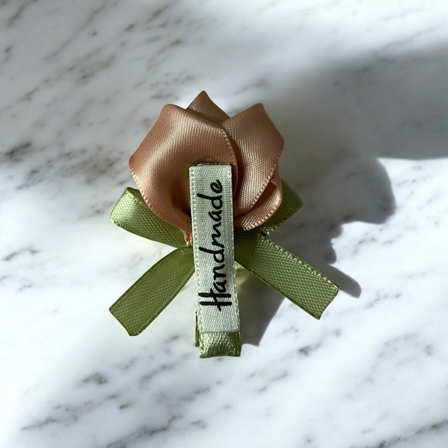 Crafted with love and precision, these rose ribbon hair clips are made with high-quality materials and securely attached to a covered alligator clip for easy and safe wear.